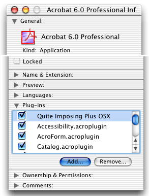 4. The information panel will appear (illustrated to the right). Click the triangle to the left of Plug-ins to open the plug-in section. 5. Click Add and you will be able to select the files you need to install the plug-in. You may have to click Add more than once to add several files. Note that you may need to install files that don't seem to be plug-ins, like manuals, because they need to be kept with the plug-ins. 6. Start Acrobat. The Plug-ins list is not updated immediately in some versions of Mac OS X, if you want to check you should close and re-open the information panel. |
